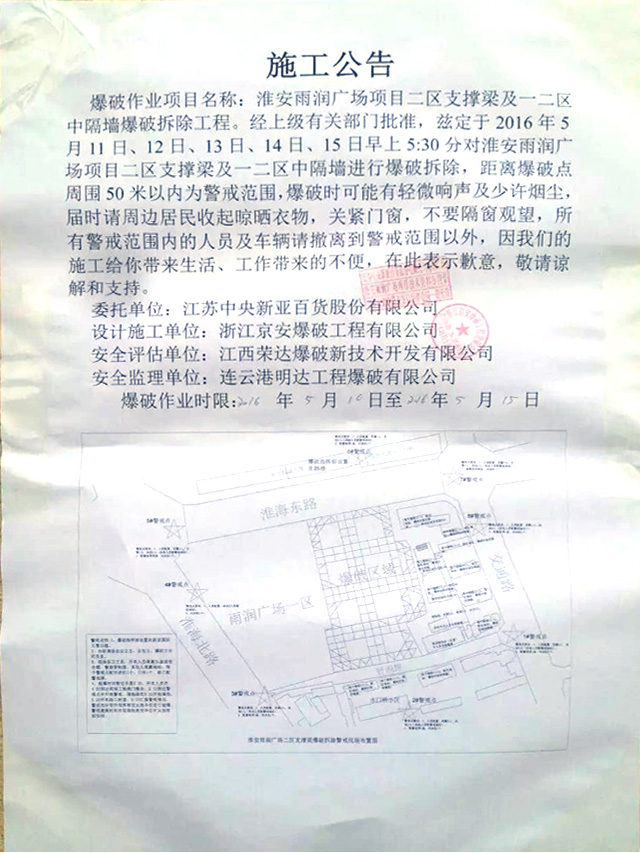 5月11日-5月15日,每天早上5:00-5:30,位于淮安核心商业地段淮海广场商业区东南片区的雨润广场总会传来一阵紧促的鞭炮般的响声,这不是开业庆典,这是爆破的声音。